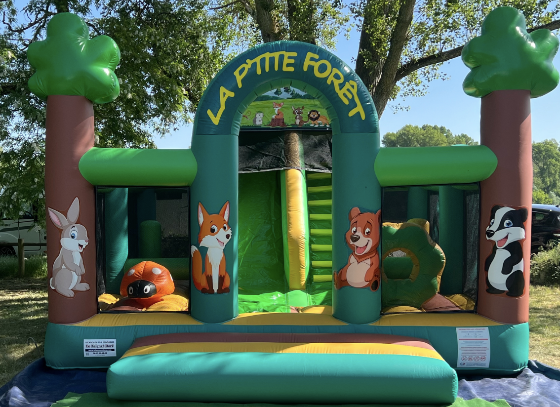 Les 2 jeux sont des mini complexes qui regroupent une structure gonflable de taille « classique » et un toboggan de 3,8m de haut sur le thème de forêt & licorne… Les enfants sont protégés des chutes grâce aux filets tout autour du jeu.